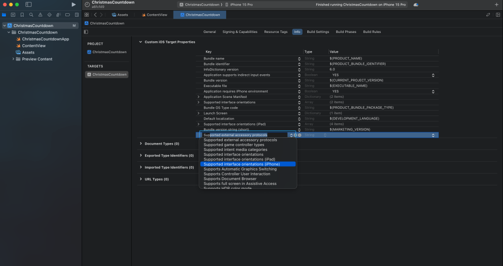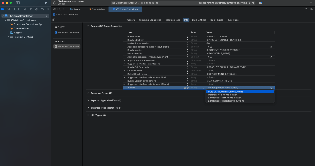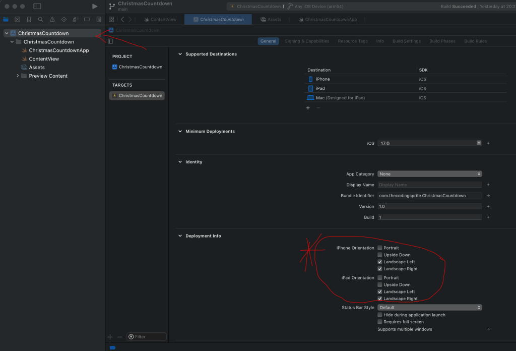 The next thing to note is I set the app to horizontal mode only. If you have never done this before it can be daunting but is super easy. There are a few ways, but the most simple way is to simply click on your project in the file navigator > then uncheck the other orientations for both iPhone & iPad.