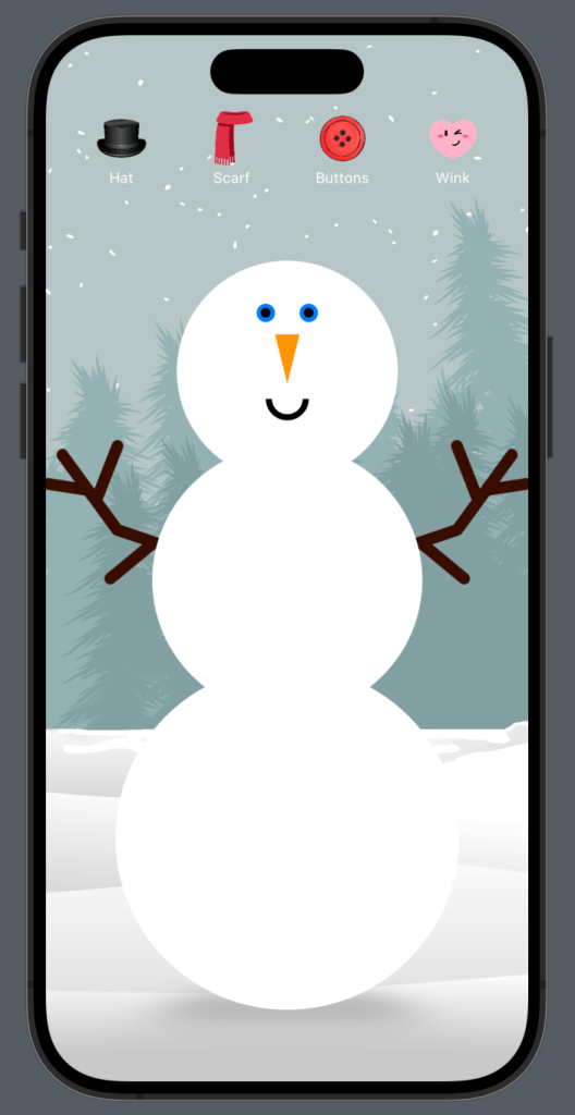 For the design part, I was happy with Mr Frosty here, but for a user there was zero interaction. So let’s add some buttons for a user to dress/undress the snowman. We always begin with adding those @State properties.
