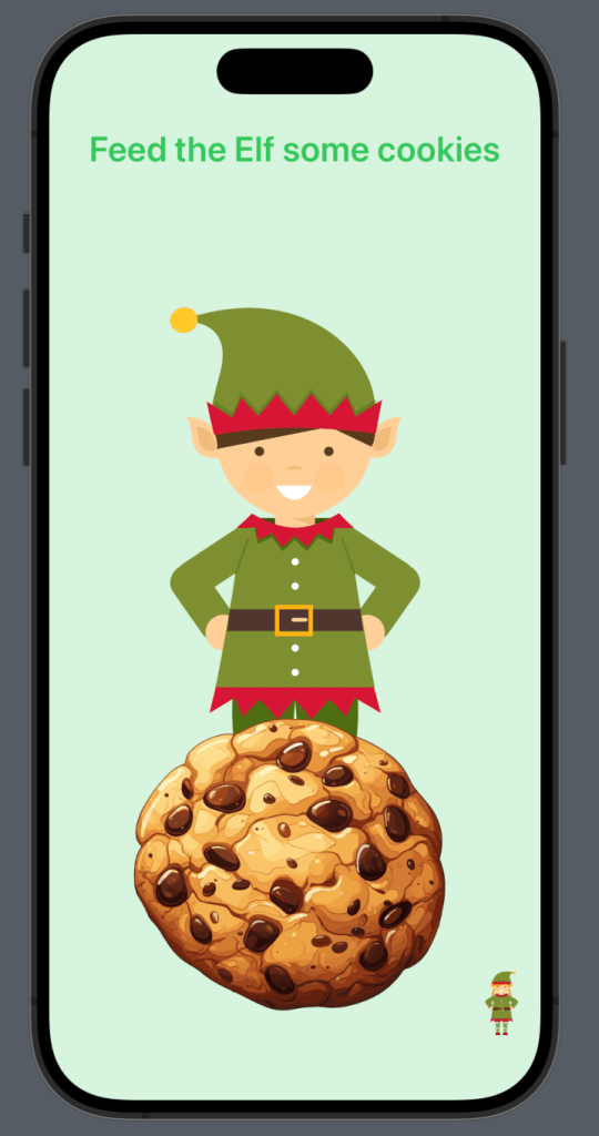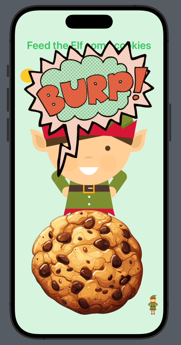 So we need a @State property to keep track of whether the elf needs to burp or not. – Tip, for testing purposes & layout of UI, don’t forget you can just change the initial value to true. You don’t have to press the cookie multiple times each and every time.