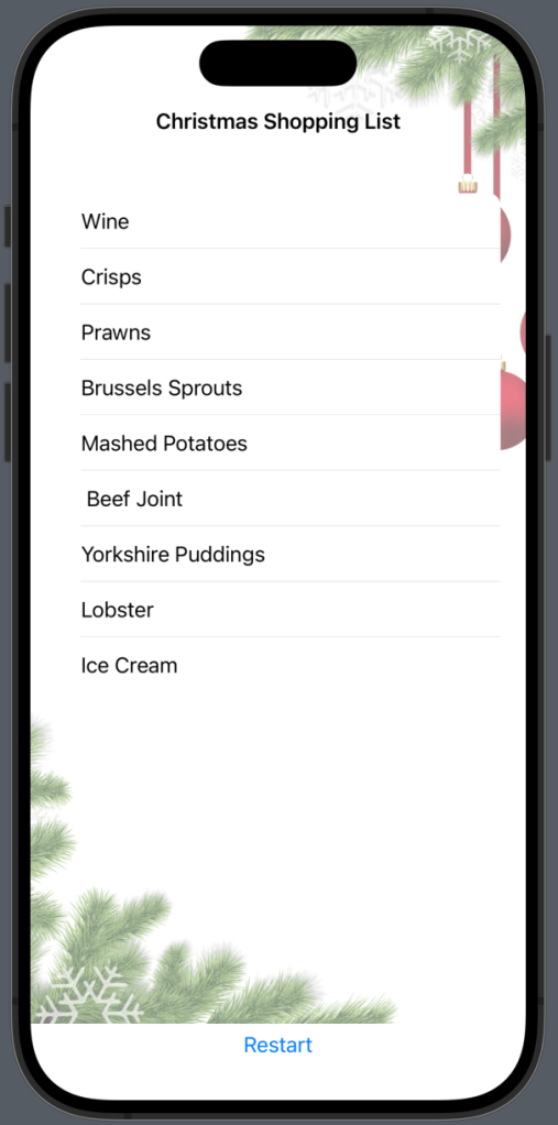 Now we want to start creating the shopping list view. I wanted to use a List for the styling & again we can pass in the created shopping list into the ForEach so each item is displayed.